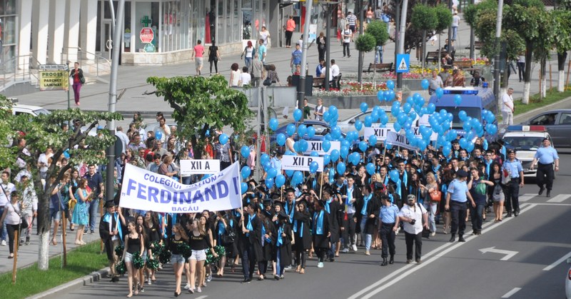 Traditionala defilare a absolventilor, cu baloane albastre in mâini, a incântat pe toata lumea, pe tot traseul de la statuia lui Stefan cel Mare pâna la primarie, pentru ca apoi marsul sa se opreasca la Universitatea „George Bacovia”, unde s-a organizat cursul festiv. Cu emotii si pareri de rau, absolventii au declarat ca nu vor uita niciodata anii de liceu.
