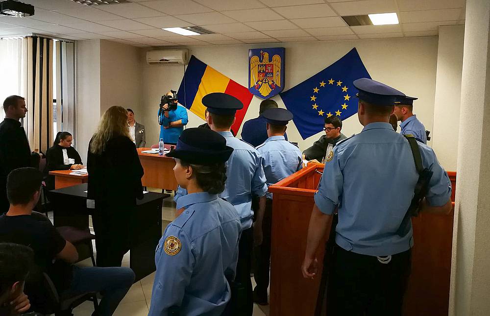 Elevii şcolii de penitenciare l-au încătuşat bine pe cel judecat, l-au dus în boxa acuzaţilor şi l-au supravegheat atent pe tot timpul procesului.
