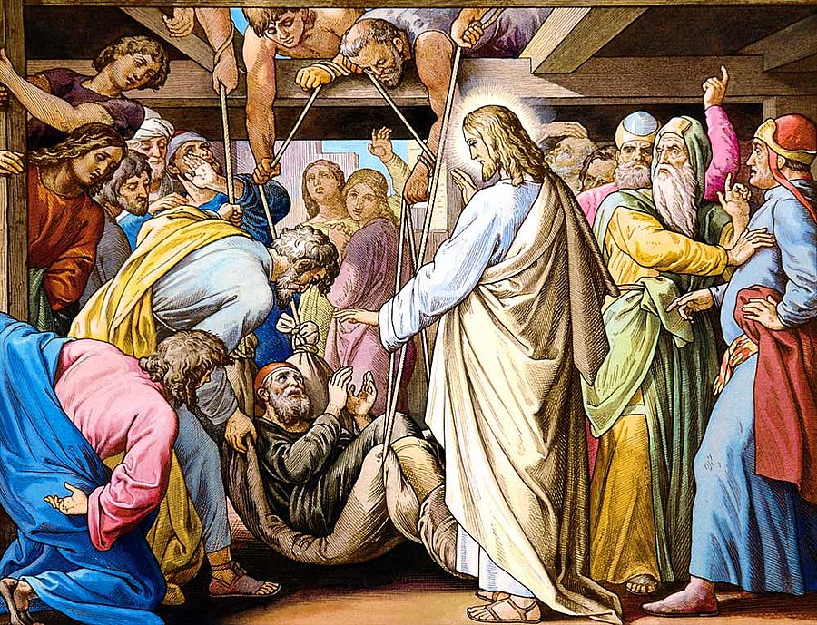 În Capernaum Mântuitorul Hristos săvârşeşte mai multe minuni. De aici capătă faima şi numele de vindecător, de persoană care face ceea ce nu mai făcuse nimeni până atunci. Este adus la El un slăbănog, un paralizat. Mântuitorul Hristos îi iartă păcatele pentru a vindeca o neputinţă fizică a acestui om. Reiese clar faptul că acest om suferea pentru păcatele sale iar pentru credinţa lor pe care Domnul o vede din efortul celor ce-l aduseseră la El, dar şi cunoscând inima bolnavului îi dăruieşte sănătatea. Însănătoşirea este evidentă – bolnavul pleacă acasă pe picioarele sale iar acest lucru scandalizează pe mulţi. Slăbănogul era atât de bolnav încât nu numai că nu era în stare să vină singur la Iisus dar nici să se dea jos de pe pat nu putea, aşa că rudele şi prietenii l-au scos din casa sa cu pat cu tot şi l-au adus la Hristos. Starea deznădăjduită a bolnavului se mai vede şi din faptul că trebuia să fie cărat de patru bărbaţi ca să fie adus la Domnul. Ajungând la casa unde se afla Iisus, cei patru au văzut că era atâta lume strânsă acolo încât ar fi fost cu neputinţă să intre. Atunci s-au hotărât să desfacă acoperişul şi să lase patul cu bolnavul zăcând drept în faţa lui Hristos. În clipa aceea Domnul vorbea cu oamenii şi-i învăţa. El nu pierdea nici o clipă: după faptă venea cuvântul; după cuvânt urma fapta. Şi cu fapta şi cu vorba căuta să-i facă pe oameni să se bucure de bine şi să creadă în bine şi în El – cel mai mare aducător şi dezvăluitor al binelui.