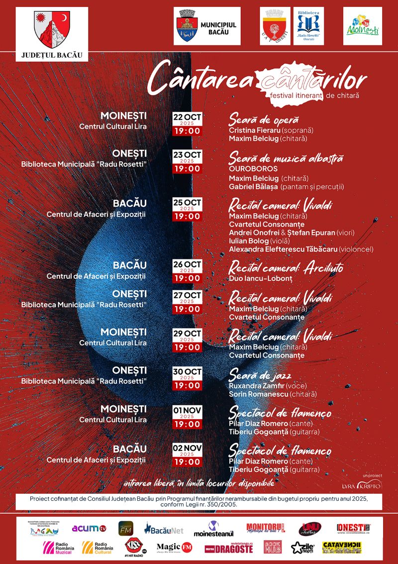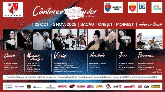 La sfârșit de octombrie și început de noiembrie, în județul Bacău are loc festivalul itinerant de chitară intitulat CÂNTAREA CÂNTĂRILOR. Invitați internaționali, artiști care strălucesc pe scenele din București și muzicieni băcăuani aduc în fața publicului din județ un program intens și variat, cu 9 concerte în 3 orașe diferite, oferind o imagine completă a posibilităților expresive ale acestui instrument minunat, atât de popular de patru secole încoace. Muzică de operă acompaniată la chitară, concerte de Vivaldi prezentate în formula de cvartet de coarde cu chitară, muzică albastră pentru chitară și percuții, duo de arciliuto – un strămoș al chitarei, jazz în formula voce și chitară și, bineînțeles, seri de flamenco, în care chitara nutrește întreaga tradiție muzicală a Spaniei – toate acestea vor face bucuria publicului între 22 octombrie și 2 noiembrie 2025, în prima sărbătoare a chitarei din Bacău. Și, pentru că intrarea la toate evenimentele este liberă, suntem siguri că nu veți vrea să ratați nimic, așa că iată calendarul complet al concertelor: