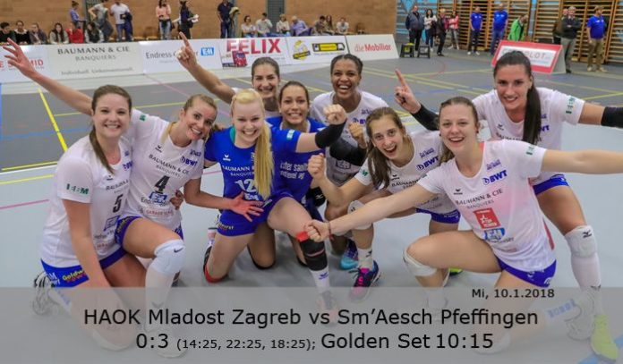 Învinse în turul șaisprezecimilor de finală cu 3-1 acasă, elvețiencele au dat lovitura în returul de miercuri, de la Zagreb. În Croația, Sm’Aesch s-a impus cu 3-0 (14, 22, 18), adjudecându-și și setul de aur cu 15-10. Prima manșă a „optimilor” dintre Sm’Aesch si Știința va avea loc în perioada 23-25 ianuarie, în Elveția.