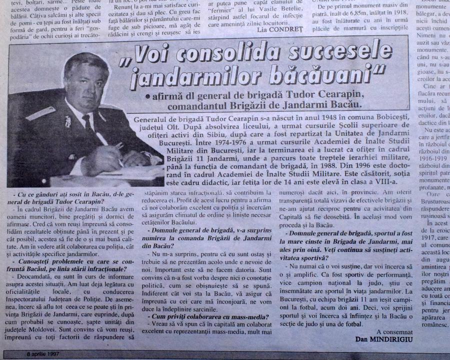 Trebuie totuși specificat că, în acea perioadă, băcăuanul avea de unde să se informeze. Apăreau pe piață 4 cotidiene și câteva săptămânale, funcționau 3 posturi de televiziune și mai multe de radio. „Am oferit transparență totală vizavi de efectivele brigăzii și ne-am ajutat reciproc pentru ca activitatea din Capitală să fie deosebită.