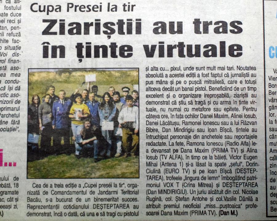 Am să-l las pe Dan Mindirigiu, abonat de mai multe ori la „lingura de lemn”- premiu acordat celor mai „pașnici” trăgători – să ne redea atmosfera acelui concurs organizat, cu prilejul Zilei Jandarmeriei, la începutul lunii aprilie, 2000: „Cea de a treia ediție a «Cupei Presei la tir», organizată de Comandamentul de Jandarmi Teritorial Bacău, s-a bucurat de un real succes. Reprezentanții cotidianului DEȘTEPTAREA au demonstrat, încă o dată, că una e să tragi cu pistolul și alta cu …pixul, unde sunt mult mai tari.