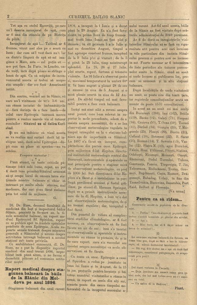 ,,Medicul Russ prezintă în fiecarec an, la finele sezonului balnear, un raport medical Epitropiei ,,Sf. Spiridon” din Iași, raport ce se publică apoi în Analele spitalelor pendinte (subordonate, n. a.) de acea Epitropie. Acele rapoarte anuale tratează despre mișcarea general a Slănicului și anume despre întreaga activitate balneară a acestei stațiuni sub toate privirile. Cu amabilitatea-i cunoscută, dl. dr. Russ ne-a pus la dispoziție raportul din anul trecut, 1896, nepublicat încă până acum și ne face o deosebită plăcere a-l comunica cetitorilor noștri”, se arată într-un preambul la acel raport. Iată și câteva date, demne de reținut pe care le-am desprins din raportul medicului Russ: În 1896 s-a construit o mica stație de observații meteorologice, după ce în 1887 au fost achiziționate mai multe instrumente și aparate; numărul vizitatorilor a fost de 2.049 persoane, în scădere față de anul anterior, probabil și din cauza timpului nefavorabil, deși Epitropia a redus la jumătate tarifele pentru cazare și tratament; registrele medicale au arătat un număr de peste 1.570 de consultații; cei mai mulți vizitatori au fost din București, Iași, Brăila, Bacău, Galați, Focșani, Craiova, Târgu-Ocna, Tecuci, Bârlad, Giurgiu, Turnu-Măgurele, Ploiești, Buzău, Botoșani, Râmnicu-Sărat, Roman etc, dar și din Transilvania, Bucovina, Basarabia, Port-Said, Belfort și Florența. Cea de-a doua parte a raportului va fi publicată în numărul următor al ziarului, despre care vom prezenta câteva detalii în episodul cinci.
