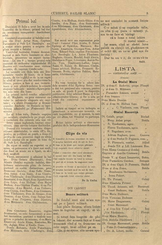 Revenim astăzi, la ,,Curierul Băilor Slănic”, Nr. 5, din 17 iulie 1897, în care sunt publicate o serie de informații și documente inedite.