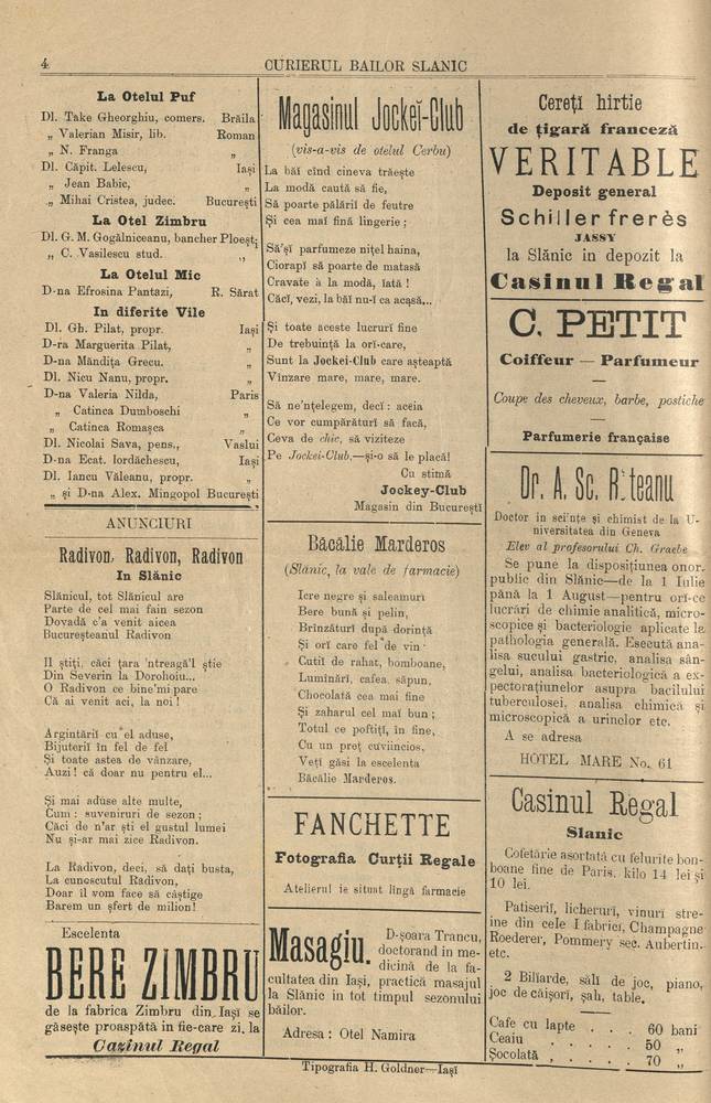 Afișe, pliante, programe (spectacole, turnee, piese), reclame comerciale: Teatrul Casinului Regal (Slănic-Moldova), 1899, 1902, 1904, p. 17.