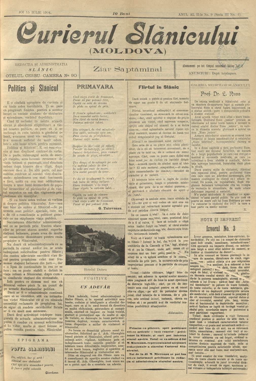 Continuăm serialul dedicat ziarului ,,Curierul Slănicului” (din colecția Bibliotecii Centrale Universitare ,,Mihai Eminescu” din Iași – BCU), prima publicație care a apărut într-o stațiune din România. În fapt, un jurnal al stațiunii Slănic-Moldova, care acoperă o perioadă istorică a stațiunii mai puțin cunoscută publicului larg, cea din perioada ,,La Belle Époque”; un model peste timp de promovare a turismului balnear al „Perlei Moldovei”.