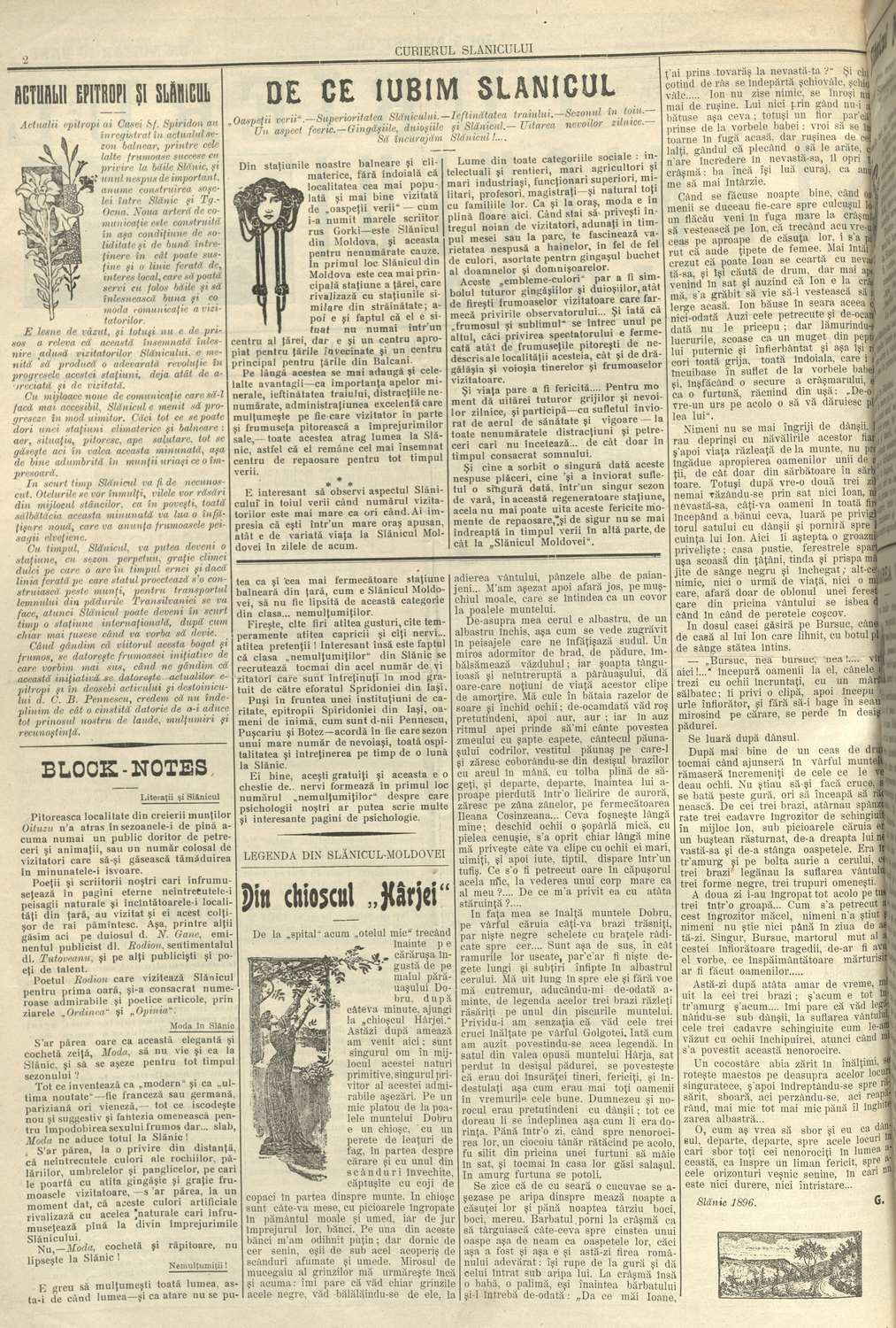 La rubrica ,,Block-Notes” ni se atrage din nou atenția asupra unor personalități care vizitează stațiunea, dar care și colaborează în paginile ziarului, alături de o altă componentă distinctă a vieții din sezonul de vară, moda: ,,Poeții și scriitori noștri care înfrumusețează în pagini eterne neîntrecutele-i peisaje naturale și încântătoarele-i localități din țară, au vizitat și ei acest colțișor de rai pământesc. Așa, printre alții găsim aici pe duiosul literat Nicolae Gane, eminentul medic-publicist Rodion, sentimentalul poet Tutoveanu, alți publiciști și poeți de talent. S-ar părea oare, ca această elegantă și cochetă zeiță, Moda, să nu fie și ea la Slănic, unde va sta tot timpul sezonului? Tot ce se inventează ca `modern` și ca `ultima noutate` – fie franceză, germană sau engleză, pariziană ori vieneză, – tot ce iscodește nou și sugestiv fantezia omenească pentru împodobirea sexului frumos… dar slab, Moda ne aduce totul la Slănic. (…) Nu, Moda, cochetă și răpitoare, nu lipsește la Slănic!”