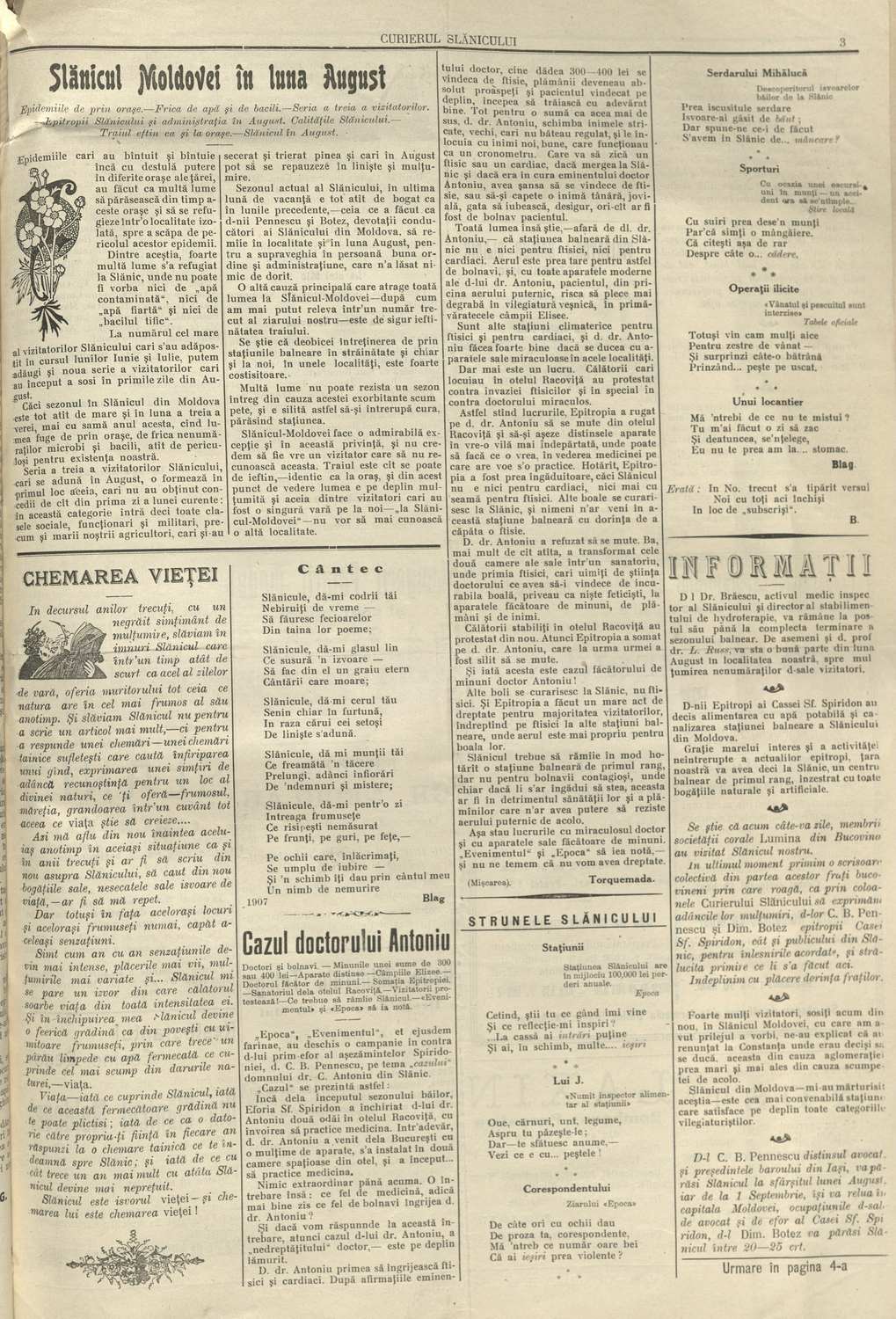 Încă un articol (,,Slănicul în luna august”), de data aceasta focusat pe luna în curs, prezintă motivele care susțin vilegiatura în minunata stațiune: ,,Multă lume părăsește marile orașe și se refugiază în localități mai izolate, pentru a scăpa de zgomot, praf, căldură și de pericolul unor epidemii. Mulți s-au refugiat la Slănic, unde nu poate fi vorba nici de `apă contaminată`, nici de`apă fiartă` și nici de `bacilul tific` (cauza febrei tifoide, n. a.). La numărul cel mare al vizitatorilor Slănicului, care s-au adăpostit în cursul lunilor iunie și iulie, putem adăuga și noua serie a vzitatorilor sosiți în primele zile ale lunii august. Căci sezonul în Slănicul din Moldova este tot atât de mare în luna a treia a verii, mai cu seamă anul acesta, când lumea fuge de prin orașe, printre altele și de frica nenumăraților microbi și bacili, atât de periculoși pentru existența noastră”.