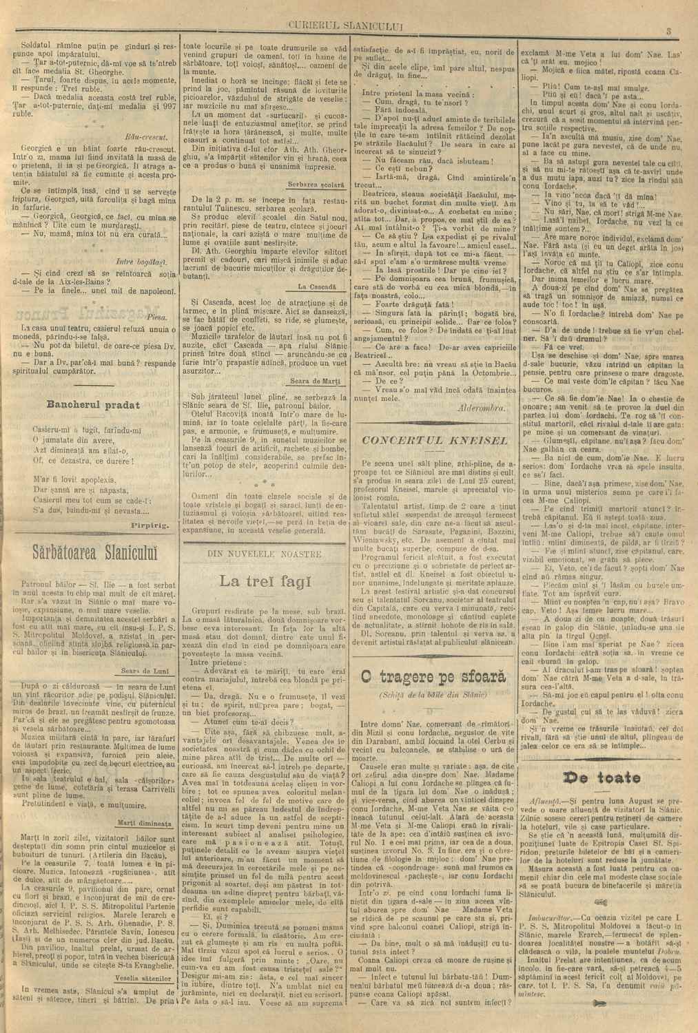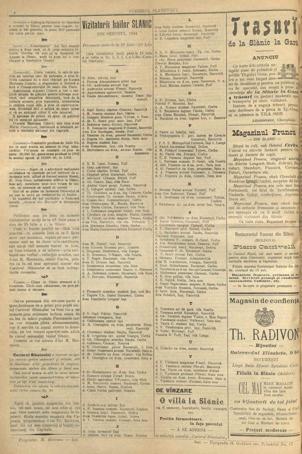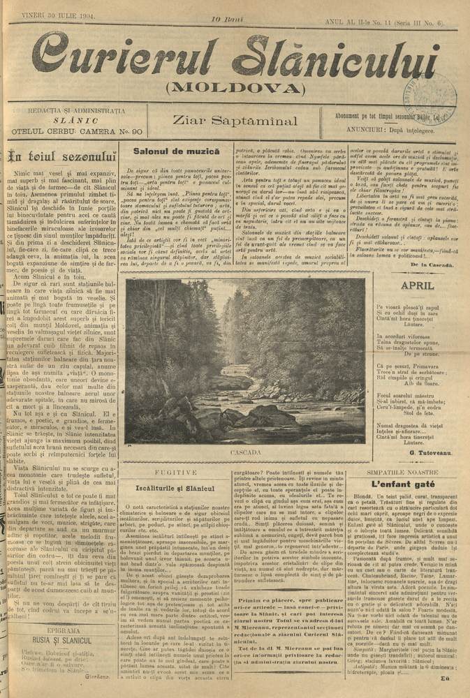 Continuăm serialul dedicat ziarului ,,Curierul Slănicului” (din colecția Bibliotecii Centrale Universitare ,,Mihai Eminescu” din Iași – BCU), prima publicație care a apărut într-o stațiune din România. În fapt, un jurnal al stațiunii Slănic-Moldova, care acoperă o perioadă istorică a stațiunii mai puțin cunoscută publicului larg, cea din perioada ,,La Belle Époque”; un model peste timp de promovare a turismului balnear al „Perlei Moldovei”.