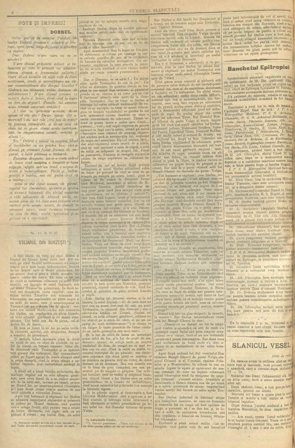 Ziarul mai cuprinde nuvele și schițe (printre acestea și nuvela ,,Stejarul din Borzești”, de Nicolae Gane, publicată pentru prima oară în 1881, în revista ,,Convorbiri literare”, nuvela ,,La trei fagi”), anecdote (în rubrica ,,Slănicul vesel”), precum și lista cu ,,Vizitatorii băilor Slănic din sezonul 1904”.