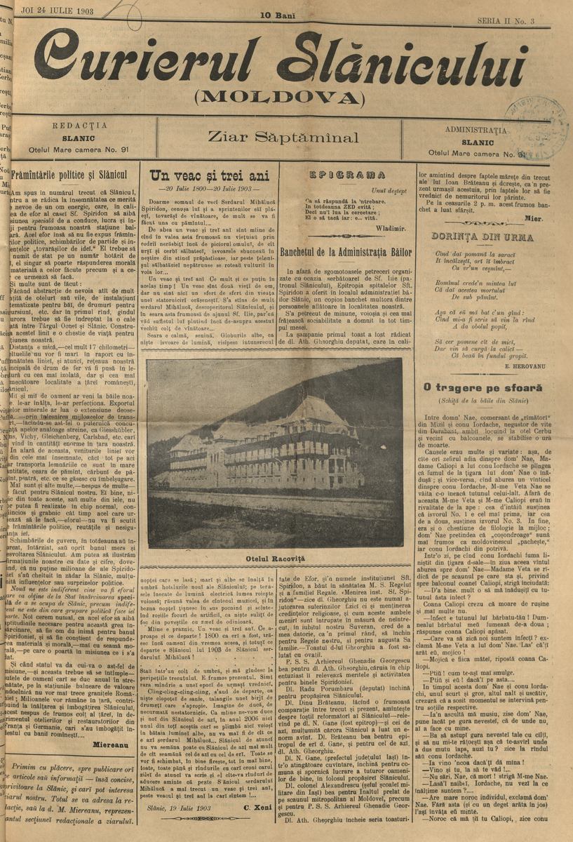 Și iată, ajungem acum la numărul 3 al Curierului, din 24 iulie 1903, care se deschide cu editorialul lui M. Miereanu, ,,Frământările politice și Slănicul”, în care autorul revine la propunerea din numărul trecut, potrivit căreia, pentru ca Slănicul să se ridice la însemnătatea pe care o merită ,,are nevoie de un om plin de energie, care, în calitatea de efor al Epitropiei ,,Sf. Spiridon” să aibă misiunea specială de a conduce, lucra și îngiji pentru frumoasa noastră stațiune balneară”. Un efor care ,,să nu fie expus frământărilor politice, schimbărilor de partide și intențiilor `tovarășilor de idei`, numit pe un număr hotărât de ani; el singur să poarte răspunderea morală și materială a celor făcute precum și a celor ce urmează să facă”. Iar invitatul special al ziarului, jurnalistul și scriitorul C. Xeni, de la ziarul ,,Epoca”, aduce un omagiu Slănicului, la împlinirea ,,unui veac și trei ani” de la descoperirea primului izvor mineral de către serdarul Mihalachi Spiridon. Și aici doresc să fac o precizare: la fel ca și în cazul lui M. Miereanu, și C. Xeni produce aceeași eroare cu privire la anul descoperirii, datându-l 20 iulie 1800, în loc de 20 iulie 1801, care constituie data reală, istorică, de la care începe practic evoluția și dezvoltarea stațiunii.