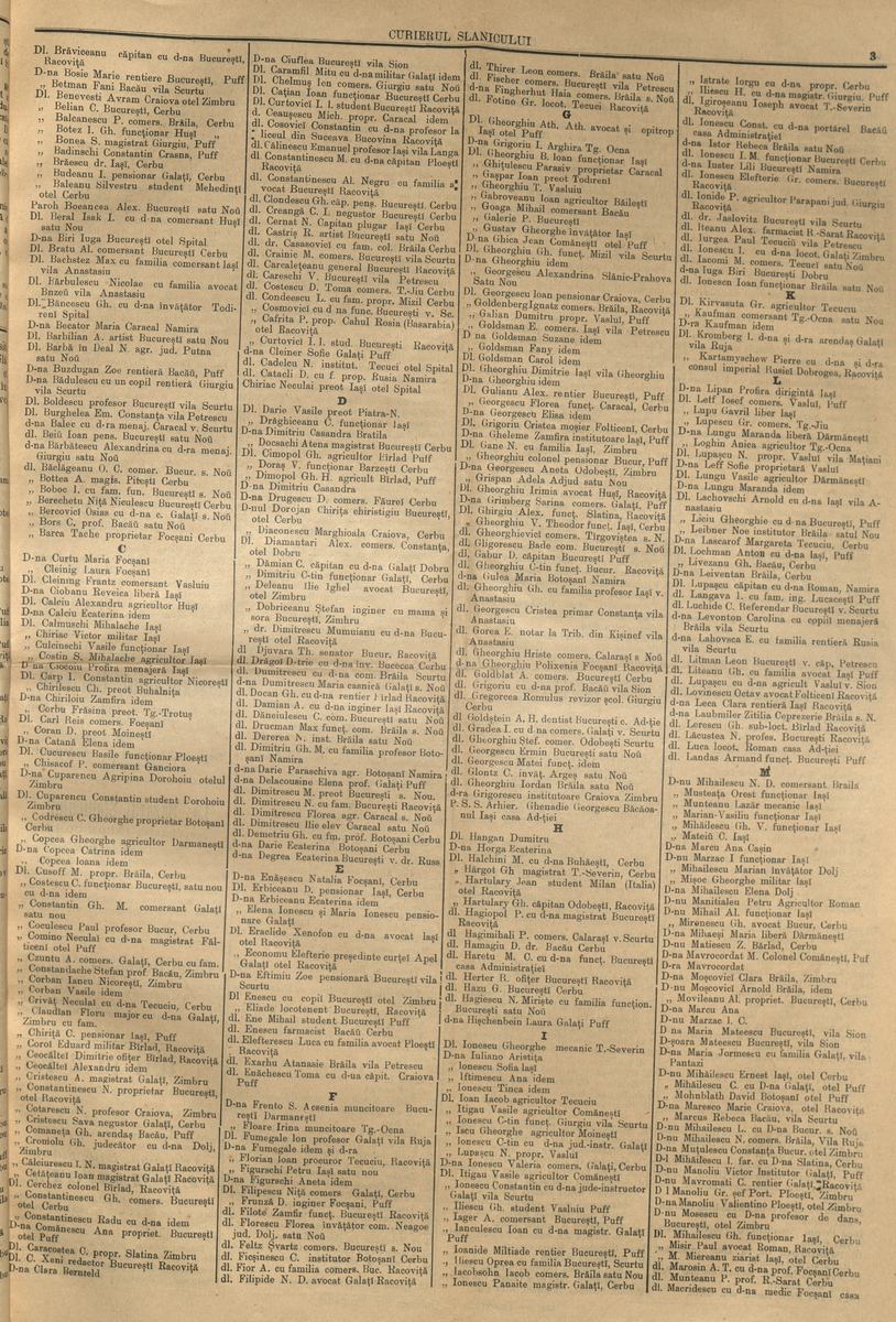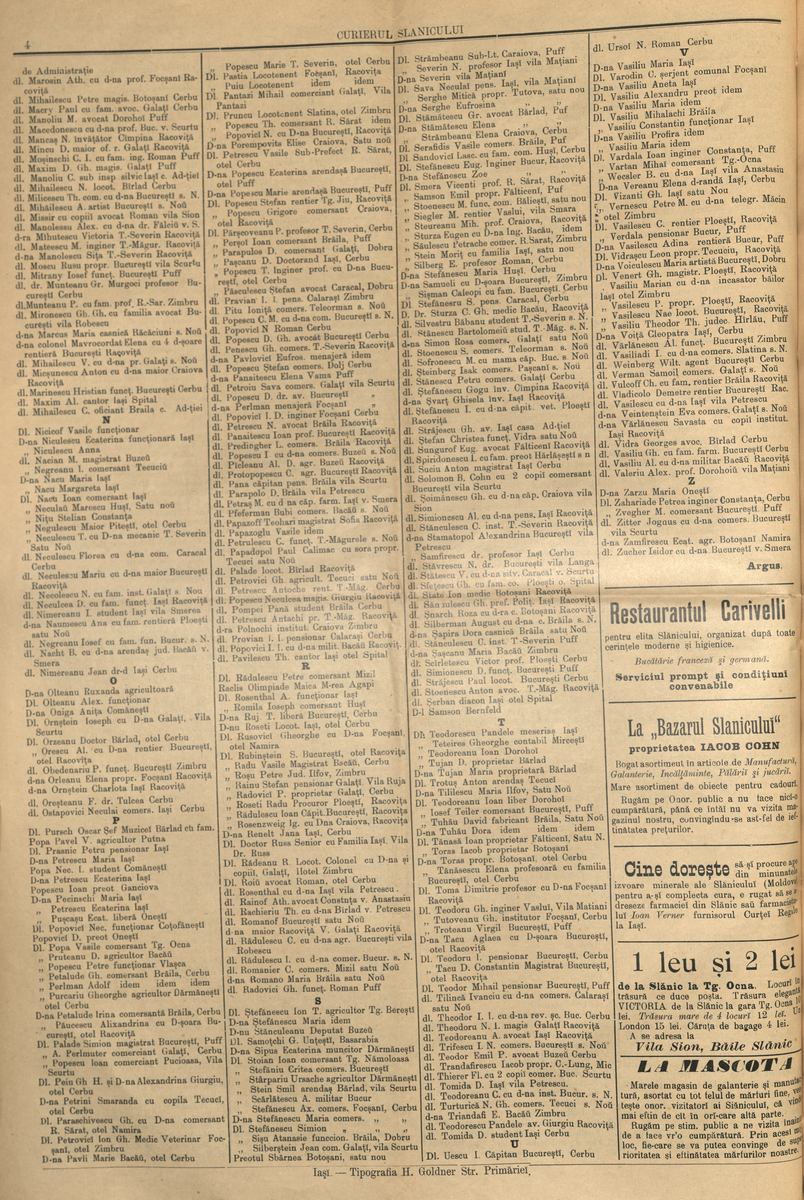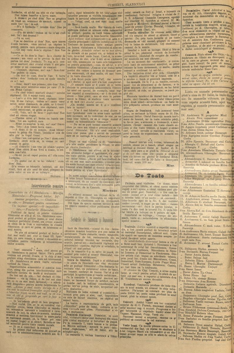 Mai aflăm din cuprinsul acestui număr al Curierului, la ,,De toate”, că valsul a fost regele dansului la Balul Florilor din 12 iulie 1903 și că, din cauza aglomerației din stațiune, însuși epitropul Casei ,,Sf. Spiridon” din Iași a primit un domn în camera sa, ,,toate odăile fiind înțesate de vizitatori”; În restaurantul ,,Carivelli” (cu specific francez și german), din splendida clădire a Cazinoului Regal, dotat cu instalații dintre cele mai moderne își desfășoară activitatea peste 60 de lucrători, conduși de dl Carivelli. Deținător al unui alt restaurant în Brăila, acesta era cunoscut în toată țara, în special în cercurile distinse, ca un ,,adevărat maestru al artei culinare, dovedind aceasta încă o dată în urmă cu ceva timp, cu ocazia unui banchet ce s-a dat în onoarea A.S.R. Principele Ferdinand”; Scriitorul și omul politic Nicolae Gane, ,,distinsul nostru literat, actualmente aflător la Slănic lucrează aici la un nou volum de Nuvele. Nici că se putea ca farmecul Slănicului să nu pună la lucru pe vrednicul fiu al Iașiului”. De fapt, începând cu acest număr, în ziar vor fi publicate mai multe anectode (la rubrica ,,Poznășii țărănești”) și fragmente din nuvelele sale (vom mai reveni asupra lui Nicu Gane în episoadele viitoare).; În Sala de teatru a Cazinoului au loc mai multe reprezentații ale trupei de la Teatrul Național din București, sub conducerea actorului și regizorului Aristide Demetriade, ,,toate comedii superbe, redate cu talent neîntrecut de către iubiții nosștri artiști”; Dr. Alexandru Brăescu (1860 – 1917), cunoscutul medic și profesor universitar, primul specialist în psihiatrie, fondator al Spitalului ,,Socola” din Iași. Așa cum se arată și în ziar, pe timpul verii a fost o perioadă medic și inspector al stațiunii balneare Slănic-Moldova, unde dădea și consultații: ,,Dr. A. Brăescu, conștiincios și activ ca întotdeauna a făcut diferite inspecțiuni necesare pentru buna stare igienică a Slănicului. De asemenea, în zorii zilei a vizitat piața, confiscând numeroase produse alimentare, care erau stricate și dăunătoare sănătății, drept pentru care activitatea dlui Brăescu este vrednică de laude”.