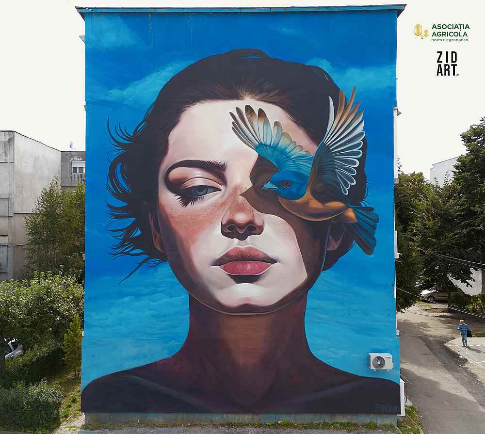 ZIDART – Street Art Festival continuă să transforme orașul într-o galerie în aer liber, aducând laolaltă artiști din întreaga lume. Una dintre cele mai recente lucrări, „Pasărea albastră”, semnată de artista portugheză Patrícia Mariano, a fost finalizată pe strada Banca Națională nr. 45.