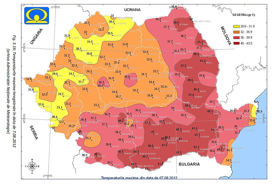 Temperaturi maxime înregistrate în Romania la data de 7 august 2012 (sursa: Viorica Dima şi colab – „Valuri de căldură în România”, Editura Printech, 2016)