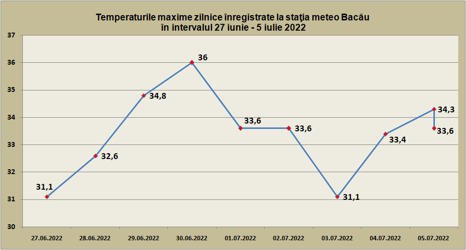 Vara 2022 ne-a oferit până acum în Bacău 16 zile tropicale. Primul val de căldură, desfăşurat pe durata a 10 zile (27 iunie – 6 iulie), deşi poate surprinde prin poziţionarea în calendar sau prin valorile înregistrate (34-36 C), se încadrează în specificul climatologic al zonelor extracarpatice.