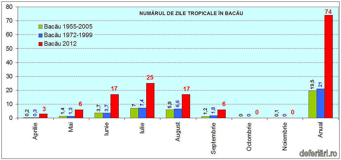 Evoluţia termică de până acum îmi aduce aminte de torida vara a anului 2012, atunci când s-au înregistrat nu mai puţin de 74 de zile tropicale, invazia persistentă a maselor de origine nord-africană determinând chiar înregistrarea unui nou record termic absolut pentru oraşul nostru (42,5 C!):