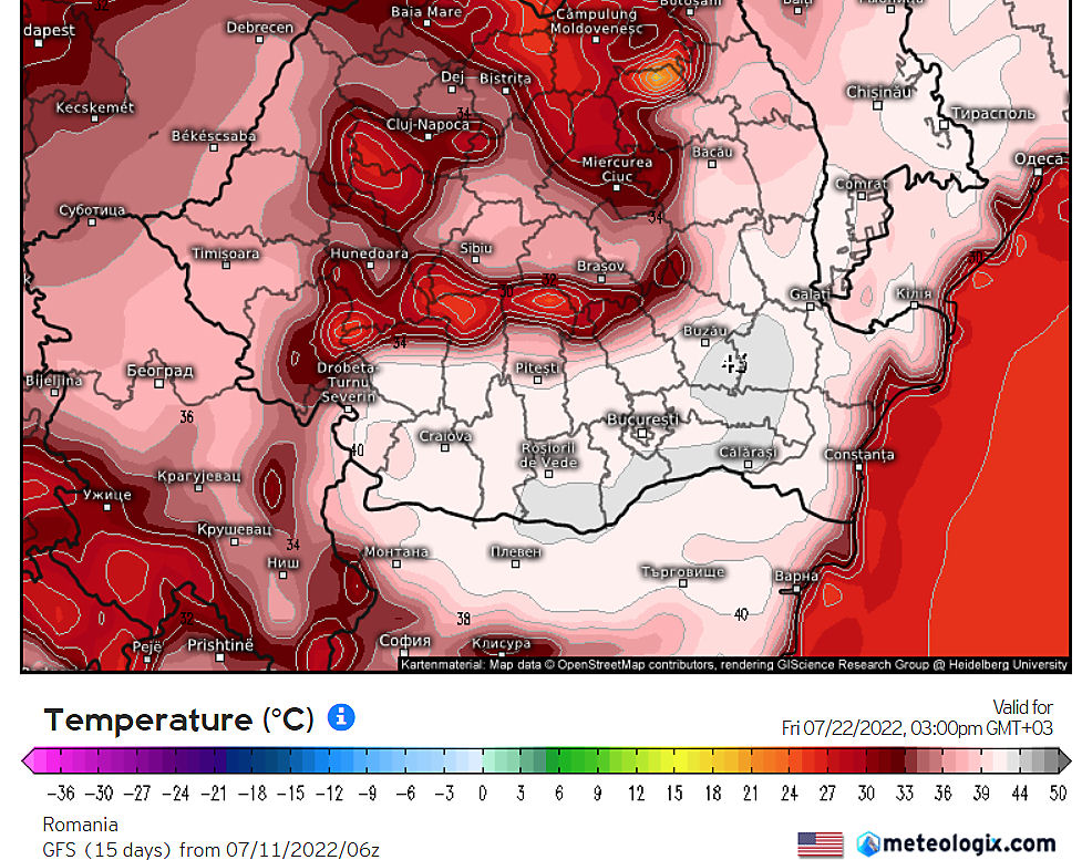 Pentru luna iulie şi începutul lunii august trebuie să ne aşteptăm la noi valuri de căldură cu intensitate sporită. Prognozele avansate de modelul GFS estimează deja pentru săptămâna viitoare valori de 39-41 C (v. graficul de mai jos), ceea ce – în combinaţie cu deficitul pluviometric semnificativ – poate duce la compromiterea culturilor agricole pe suprafeţe întinse din judeţ.