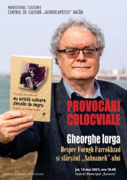 Joi, 13 mai: ora 18.00, Teatrul Municipal „Bacovia” – PROVOCĂRI COLOCVIALE: „Despre Forugh Farrokhzad și sfârșitul Șahnameh-ului”, cu prof. dr. Gheorghe Iorga; Spectacolul cărţii: 7 SCRISORI CU AUTOAPRINDERE, după volumul „Nu există culoare dincolo de negru. Scrisori cu autoaprindere”, de Forugh Farrokhzād, Editura Tracus Arte, 2021, traducere din limba persană, cuvânt-înainte și note de Gheorghe Iorga. Spectacolul îi va avea ca protagoniști pe: Ali Asghar Rahimi, compozitor și instrumentalist, Iran; Eliza Noemi Judeu, actor la Teatrul Municipal „Bacovia”; Gabriel Scalschi, dansator, masterand la Universitatea de Arte „George Enescu”, Iași. Scenariul și regia: Gheorghe Geo Popa.
