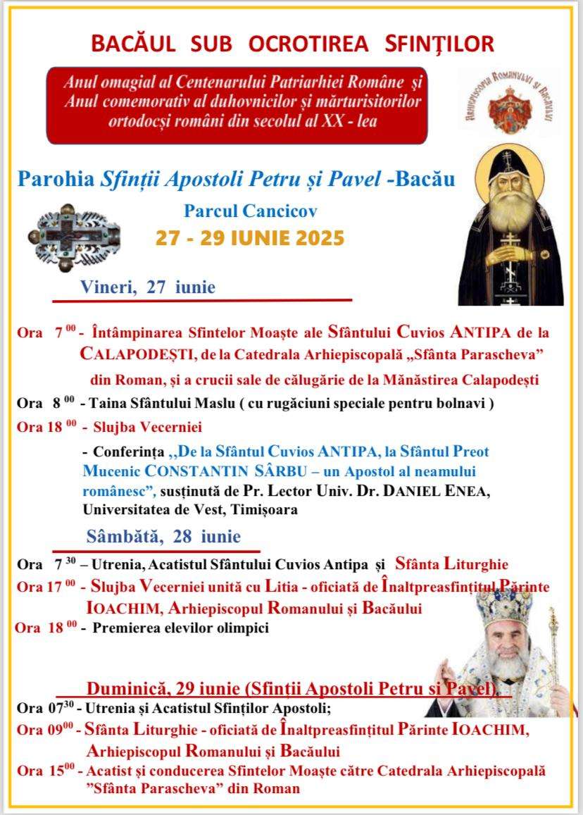Cu binecuvântarea Înaltpreasfințitului Părinte Ioachim, Arhiepiscopul Romanului și Bacăului, la Biserica „Sfinții Apostoli Petru și Pavel” din Parcul Cancicov (lângă Spitalul Județean) vor fi aduse Sfintele Moaște ale Sfântului Cuvios Antipa de la Calapodești și ale Sfântului Preot Mucenic Constantin Sârbu.