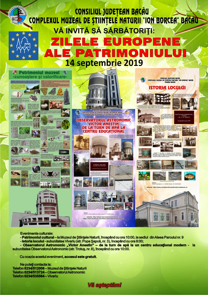 • la Subunitatea Vivariu – Istoria locului, începând cu ora 9.00 prezintă publicului interesat detalii cu privire la monumentul istoric în care îşi desfăşoară activitatea, dar şi detalii inedite legate de istoricul expoziţiilor organizate de-a lungul timpului în acest lăcaş de cultură băcăuan.