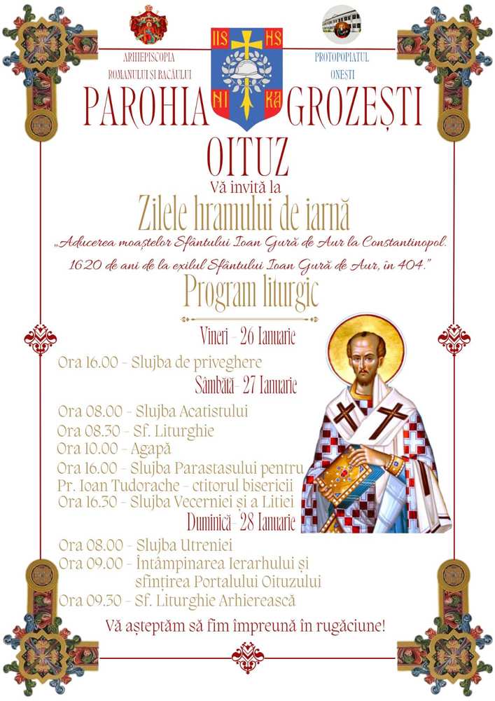 La zece ani de la hirotonia preoților bisericii istorice a Oituzului, având binecuvântarea Înaltpreasfințitului Părinte IOACHIM – Arhiepiscopul Romanului și Bacăului, în perioada 26-28 ianuarie sunt organizate, în rugăciune, Zilele hramului de iarnă al Parohei Grozești-Oituz, Sărbătoarea „Aducerea moaștelor Sfântului Ierarh Ioan Gură de Aur la Constantinopol” și „1620 de ani de la exilul Sfântului Ioan, în 404”.