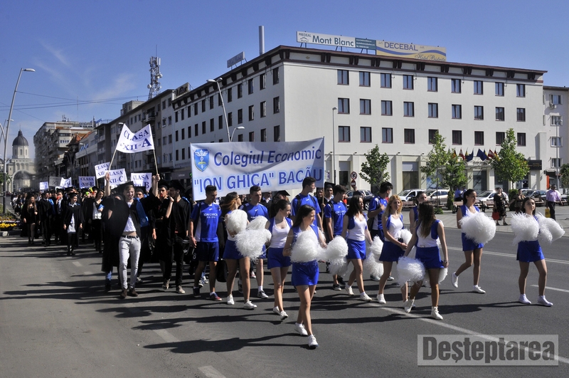 Cel mai mare liceu al Bacaului, Colegiul Economic „Ion Ghica” a fost ieri in sarbatoare. A fost sarbatoarea absolventilor. Nu mai putin de 16 clase, cu 408 economisti, au defilat prin oras si au strigat bucuria finalizarii celor mai frumosi ani – anii de liceu. Conducerea unitatii de invatamânt, cadrele didactice, parintii si invitatii, cu totii au luat parte la marsul promotiei 2015, pentru ca apoi, la cursul festiv, sala Teatrului de Vara sa fie pur si simplu inundata de robe, baloane albastre, culoare, amintiri, povesti, multumiri, regrete, toate marca „Economic”.