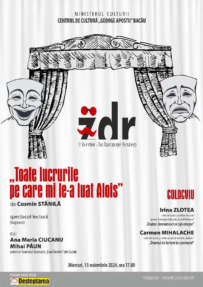 Cu această ocazie, Teatrul Dramatic „Fani Tardini” Galați își extinde activitățile repertoriale și lansează proiectul LECTURI la Centrul de Cultură „George Apostu” din Bacău, prin prezența actorilor gălățeni Ana Maria Ciucanu și Mihai Păun, care vor lectura fragmente din piesa „Toate lucrurile pe care mi le-a luat Alois”, ce aparține dramaturgului Cosmin Stănilă.