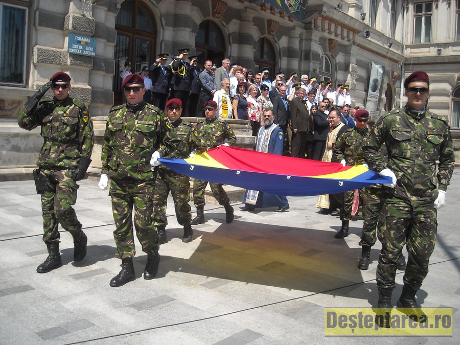 Când orologiul Palatului Administrativ a bătut de ora 12.00, reprezentanții autorităților locale au ieșit în Piața Tricolorului pentru a asista la ceremonialul militar și religios organizat de garnizoana Bacău cu ocazia Zilei Drapelului. Valentin Ivancea, subprefectul județului Bacău, însoțit de înlocuitorul comandantului garnizoanei, cdor.dr. Petrică Havreșciuc, au primit onorul gărzii, au salutat drapelul de luptă și au trecut în revistă garda de onoare. Cdor. dr. Petrică Havreșciuc le-a vorbit celor prezenți despre semnificația tricolorului și a drapelului de luptă, iar subprefectul Valentin Ivancea a dat citire mesajului transmis de Carmen-Daniela Dan, ministrul Afacerilor Interne.