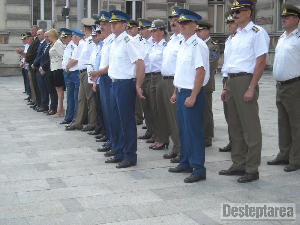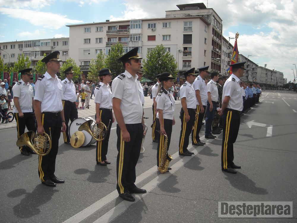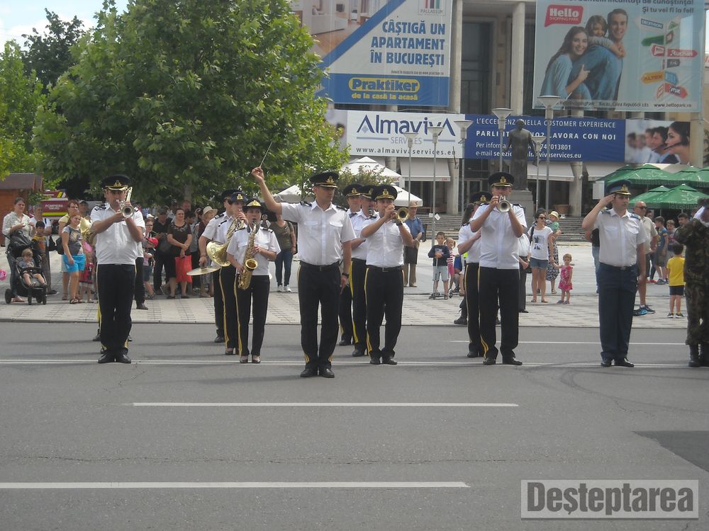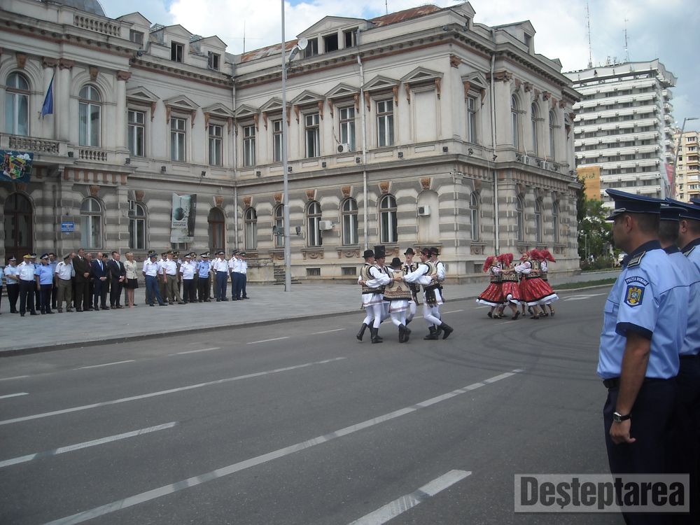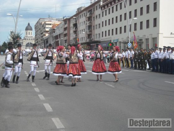 Discursul istoricului a fost întrerupt la un moment dat de survolul celor cinci aeronave IAR 99 Șoim ale Bazei 95 Aeriene Bacău care se întorceau de la mitingul aerian organizat de Baza 71 Aeriană Câmpia Turzii, unde au evoluat cu un zbor demonstrativ. Intervenția lui Anton Coșa a fost urmată de un moment artistic susținut de Ansamblul Folcloric “Plaiuri băcăuane” și de intonarea imnului național interpretat vocal de sergent Rebeca Ciotloș și instrumental de Muzica militară. Legat de acest moment, amintim că printre imnurile naționale pe care le-a avut țara noastră de-a lungul timpului au fost: “Trăiască regele”, “Zdrobite cătușe”, “Te slăvim, Românie!”, “Pe-al nostru steag e scris Unire” și “Trei culori”.