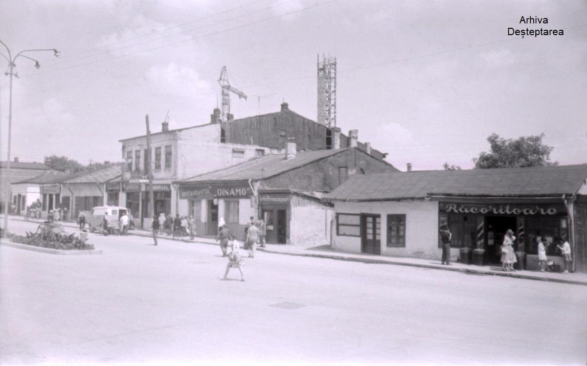 În prim-plan, vedem o stradă modestă, cu trotuare înguste și o infrastructură simplă. De o parte a drumului, se aliniază câteva clădiri scunde, vechi, cu acoperișuri joase din tablă și fațade ponosite. Aici se aflau, la acea vreme, punctele comerciale de bază ale zonei: o răcoritoare (magazin sau local cu sucuri și înghețată), un restaurant „Dinamo”, o alimentară și o agenție Loto Pronosport – fiecare dintre ele martori ai unui oraș aflat în tranziție.