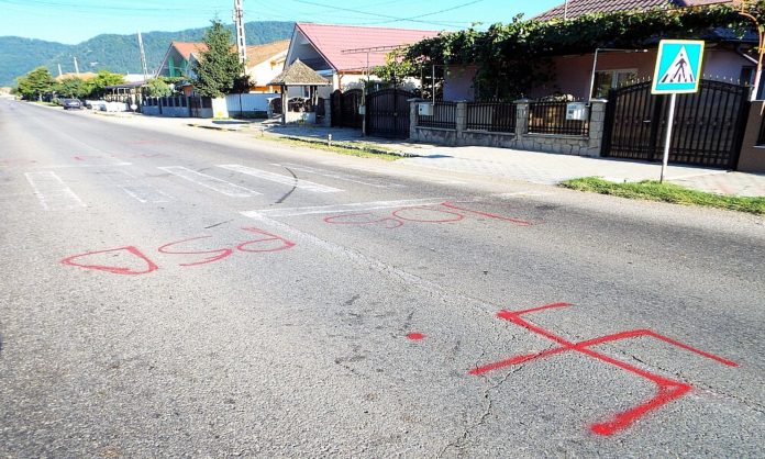 Trecerea de pietoni de pe DN11A aflată chiar în fața primăriei din comuna Oituz a fost marcată, zilele trecute, de înscrisuri ofensatoare la adresa PSD, dar și de o zvastică. Într-o dimineață, pe asfalt a apărut scris, cu vopsea roșie, de două ori „Jos PSD” și tot cu roșu a fost desenată și zvastica. Alături cineva a reușit să mai scrie litera „M”, dar următoarea literă abia a fost începută și apoi abandonată.